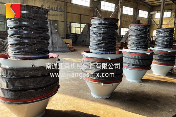 ※伸縮節(jié)特點:伸縮節(jié)分為內(nèi)外兩層(內(nèi)層卸料,外層收塵),伸縮節(jié)的升降采用3根繩索來拉動,如左圖所示,通過鋼絲繩的拉力,可防止在收塵過程中由于收塵的負壓使外層布袋被吸癟的缺點,從而保證了伸縮節(jié)之間的收塵通道通暢,又增強了伸縮節(jié)的使用壽命。外層使用防雨帆布。